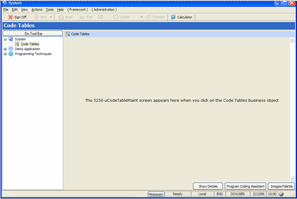 ユーザーがフレームワーク・アプリケーションの Code Tables をクリックすると、すぐに uCodeTableMaint 5250 画面にナビゲートされます。