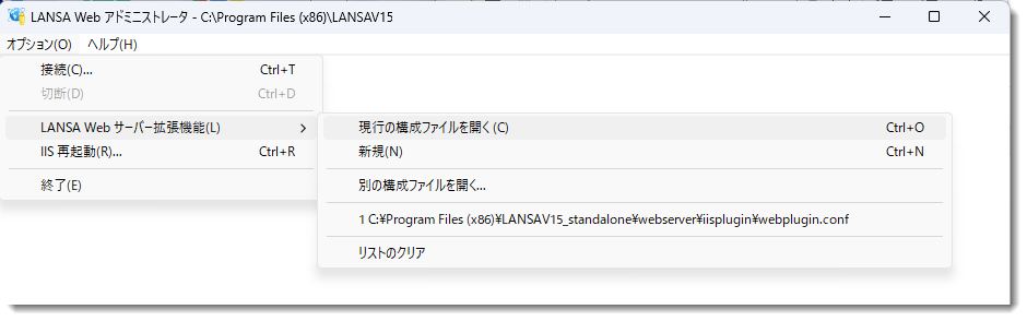 - 別の構成ファイルを開く…: ファイル システムを参照して、別のLANSA Web サーバー拡張機能の構成ファイルを開きます。