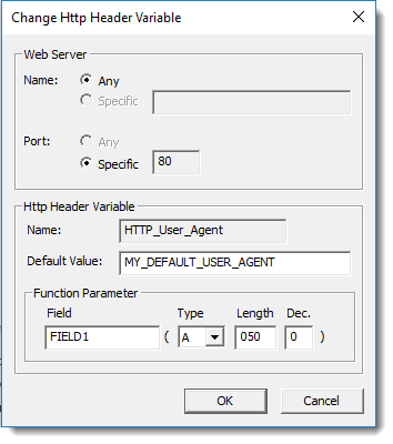 HTTPヘッダー変数の追加/変更 ダイアログ・ボックスには、HTTPヘッダー変数で使用される詳細が表示され、HTTPヘッダー変数の省略値とHTTPヘッダー変数の内容をデータ/アプリケーション・サーバーに送信する方法 (ファンクション パラメータ) を指定できます。