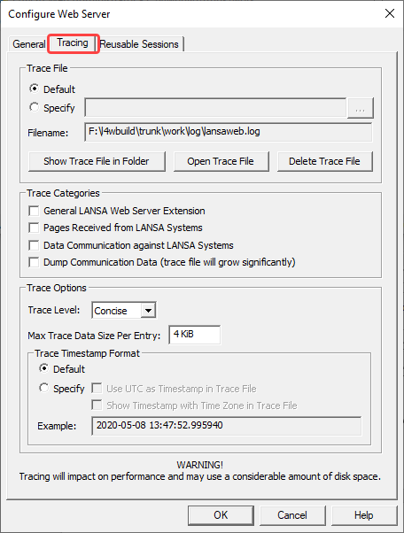 • LANSA Webサーバー拡張機能では、開始時と停止時にはメッセージが常に生成されます。LANSA Webサーバー拡張機能で深刻な問題が発生した場合、トレース・ファイルにメッセージが追加されます。