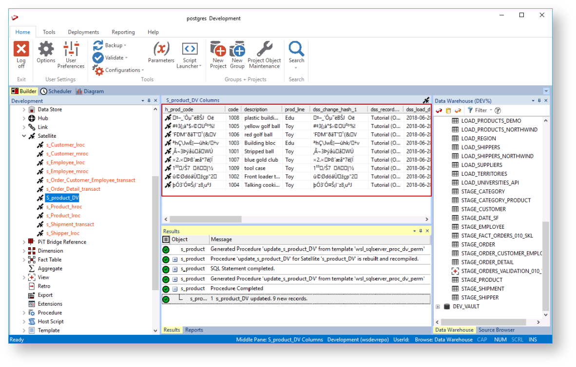 After successfully creating and populating the Data Vault Stage table, you can now create the Hub, Link, and Satellite tables. The Hub, Link, and Change hash keys information stored in the Data Vault Stage table is used by the Wizard for building these Data Vault objects.