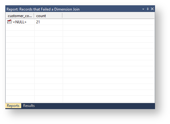 This report shows the dimension business key(s) that could not be found in a specified dimension when a specified staging table was last updated. This report will show null values, blank values, and business keys not found in the dimension.